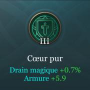 L'équipement est prévu pour faire des dégâts alors pourquoi ne pas en profiter pour récupérer sa vie ? C'est pour cela que j'ai choisi les arcanas avec du Drain magique. Les arcanas Prière et Coeur Pur vous donneront un total de +23% de drain magique.