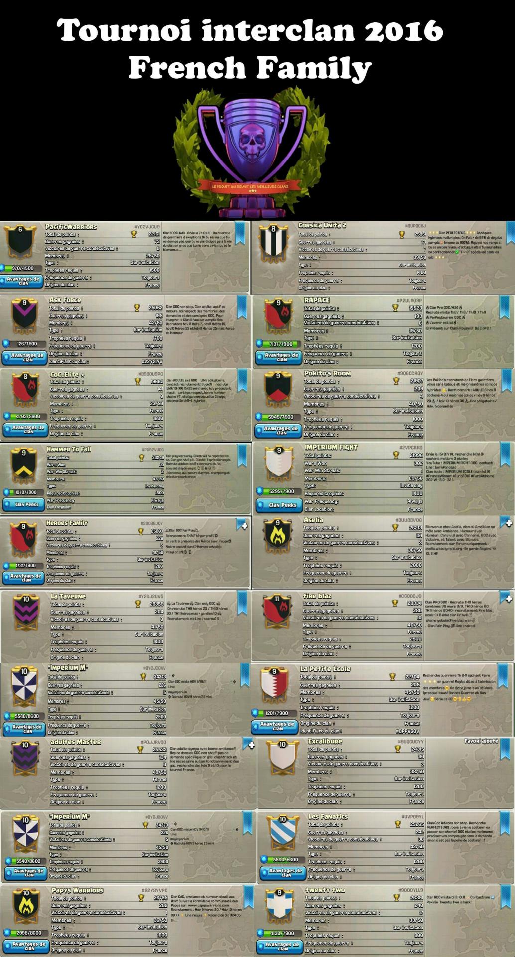 Peut-être que vous ne connaissez pas tous les clans participants car ils n'apparaîssent pas dans le top 200 FR.